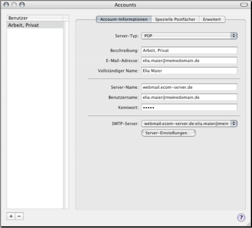 4. Geben Sie Ihren Namen und Ihre E-Mail-Adresse ein. Wählen Sie als Kontotyp "POP3" aus, geben Sie als Posteingangsserver "webmail.ecom-server.de" und als Postausgangsserver "webmail.ecom-server.de" ein. Tragen Sie Ihre E-Mail-Adresse als Benutzernamen ein und das dazugehörige Passwort als Kennwort. Aus Sicherheitsgründen empfehlen wir Ihnen, das Kennwort nicht zu speichern. Wenn Sie Ihre E-Mails im später eingerichteten Konto abrufen, werden Sie automatisch nach dem Kennwort bzw. Passwort gefragt.