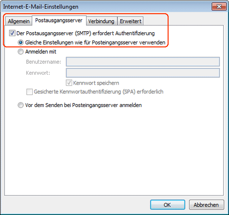 5. Wählen Sie die Registerkarte "Postausgangsserver" aus. Setzen Sie das Häkchen neben "Der Postausgangsserver erfordert Authentifizierung".