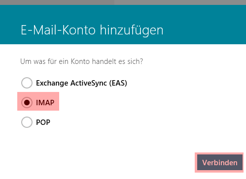 5. Wählen Sie den Servertyp IMAP aus und klicken auf "verbinden".
